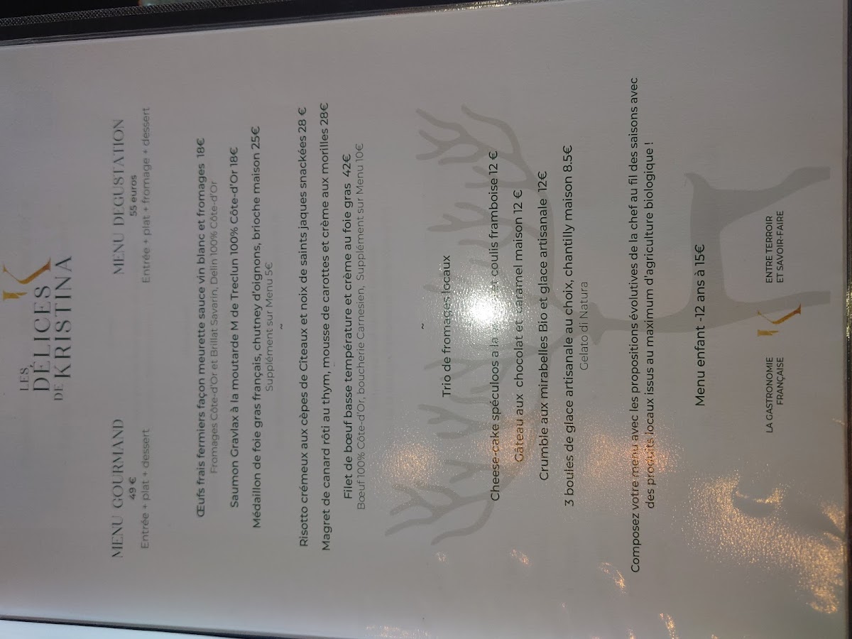 The menu at Les Délices De Kristina reflects a confident balance between refined French tradition and comforting bistro-style creativity, with each dish contributing to a cohesive culinary identity. Signature mains such as Veal Wellington on Pumpkin Puree, Filet Mignon En Croûte Sauce Foie Gras, and Magret de Canard Basse Température highlight a strong focus on premium meats prepared with precision and depth, while hearty classics like Joue de Boeuf, Lasagnes, and Risotto Crémeux bring warmth and generosity to the lineup. Poultry dishes including Suprême de Poulet Fermier Gratiné À la Noisette Et Jus À la Truffe, Poulet Écrasé de Pomme de Terre, and Poulet Roti Et Purée Aux Marrons emphasize rustic flavors elevated by thoughtful sauces and textures. The chef’s creativity is also evident in plates such as Burger Du Chef and Filet Se Boeuf B Tlet Son Foie Gras Pocile, which reinterpret familiar ideas with gourmet flair. Starters and lighter options like Foie Gras Poilé, Gravlax de Saumon, Rillettes de la Mer, Oeuf Peamien Façon Meunelte Sauce Vin Blanc, and Samoussa D'escargot Salade de Jeunes Pousses add elegance and variety, setting a refined tone before the main courses. Desserts including Café Gourmand, Soufflé Citron Glacé, and Tarte Meringuée provide a well-rounded and satisfying finish, blending indulgence with freshness. Complemented by selections such as Vin Blanc de Bourgogne, the menu as a whole feels carefully curated, showcasing consistency in quality, respect for French culinary roots, and a clear passion for delivering a complete and memorable dining experience through its dishes.